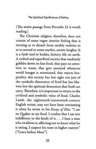 As a society we are obsessed with food. Our supermarkets are overfilled, recipe books crowd the aisles of bookstores, and there are more cooking shows than can be counted. But we are also addicted to food, burden our bodies with toxic food, and are the most obese nation on earth with a growing segment of people who have little access to healthy food or enough food at all. What is the meaning bread, wine and water hold for our material and spiritual lives? How can we who have more food than appetite learn to respect and cherish the food we have, share it in joyful fellowship, and not forget those who have more appetite than food. In this concise book Cardinal Ravasi, who is known for his interest and understanding of contemporary culture, leads readers to the spiritual, and biblical core of Christian wisdom, respect and enjoyment of food. Discussion questions help the reader to deepen his or her understanding, and use the book for reading groups.