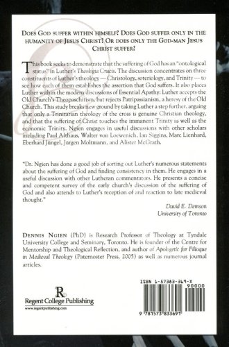 Does God suffer within himself? Does God suffer only in the humanity of Jesus Christ? Or does only the God-man Jesus Christ suffer? This book seeks to demonstrate that the suffering of God has an "ontological status" in Luther's Theologia Crucis. The discussion concentrates on three constituents of Luther's theology – Christology, soteriology, and Trinity – to see how each of them establishes the assertion that God suffers. It also places Luther within the modern discussions of Essential Apathy: Luther accepts the Old Church's Theopaschitism, but rejects Patripassianism, a heresy of the Old Church. This study breaks new ground by taking Luther a step further, arguing that only a Trinitarian theology of the cross is genuine Christian theology, and that the suffering of Christ touches the immanent Trinity as well as the economic Trinity. Ngien engages in useful discussions with other scholars including Paul Althaus, Walter von Loewenich, Ian Siggins, Marc Lienhard, Eberhard Jngel, Jrgen Moltmann, and Alister McGrath. "Dr. Ngien has done a good job of sorting out Luther's numerous statements about the suffering of God and finding consistency in them. He engages in a useful discussion with other Lutheran commentators. He presents a concise and competent survey of the early church's discussion of the suffering of God and also attends to Luther's reception of and reaction to late medieval thought." – David E. Demson, University of Toronto Dennis Ngien (PhD) is Research Professor of Theology at Tyndale University College and Seminary, Toronto. He is founder of the Centre for Mentorship and Theological Reflection, and author of Apologetic for Filioque in Medieval Theology (Paternoster Press,2005) as well as numerous journal articles.