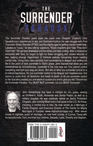 The Surrender Paradox peels back the cover over Chaplain Captain John VanderKaay's experiences in war and Hurricane Katrina, his own struggle with Post Traumatic Stress Disorder and the stigma against mental health help. Labeled as "crazy," he was told by superiors, "Good chaplains give help. They don't need help." After a miraculous encounter with God, he began to fight for those struggling with unseen wounds of war, helping change Department of Defense policies concerning those needing mental help. John learned that when you are overwhelmed by circumstances, surrender is the only way out. In The Surrender Paradox, he explores the nature of relinquishment and humility, and how the way down often leads to the way up.