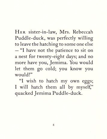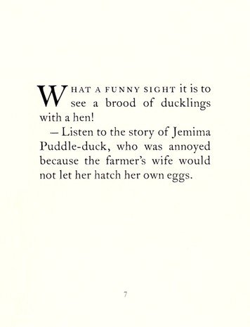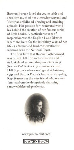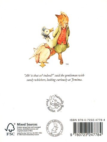 The Tale of Jemima Puddle-Duck is an original classic by Beatrix Potter. Poor Jemima. All she wants to do is lay her eggs in peace, and be allowed to hatch them herself. At last she flies off and finds the perfect place. Little does the silly duck realise that the charming gentleman who has lent her his woodshed is busily planning a delicious meal of . . . roast duck! Jemima was a real duck belonging to Beatrix Potter, who lived at her farm, Hill Top. The story also features Beatrix's own sheepdog, Kep, who thankfully manages to save Jemima from a nasty fate! Beatrix Potter is regarded as one of the world's best-loved children's authors of all time. From her first book, The Tale of Peter Rabbit, published by Frederick Warne in 1902, she went on to create a series of stories based around animal characters including Mrs. Tiggy-winkle, Benjamin Bunny, Jemima Puddle-duck, Mr. Jeremy Fisher and Tom Kitten. Her humorous, lively tales and beautiful illustrations have become a natural part of childhood. With revenue from the sales of her books, Beatrix Potter bought a farm – Hill Top – in the English Lake District, where she later became a farmer and prize-winning sheep breeder. She launched the now vast merchandise programme by patenting the very first Peter Rabbit doll in 1903. The product range continues to grow today with licences around the world including baby clothing and bedding, nursery decor products and collectables. Upon her death, Beatrix Potter left 14 farms and over 4000 acres of Lake District farmland to the National Trust so that the place that she loved would remain undeveloped and protected for future generations to enjoy. Today Beatrix Potter's original 23 tales are still published by Frederick Warne, alongside a wide range of other formats including baby books, activity books and gift and sound books. The Tale of Jemima Puddle-Duck is number nine in Beatrix Potter's series of 23 little books. Look out for the rest! 1 The Tale of Peter Rabbit 2 The Tale of Squirrel Nutkin 3 The Tailor of Gloucester 4 The Tale of Benjamin Bunny 5 The Tale of Two Bad Mice 6 The Tale of Mrs. Tiggy-Winkle 7 The Tale of Mr. Jeremy Fisher 8 The Tale of Tom Kitten 9 The Tale of Jemima Puddle-Duck 10 The Tale of the Flopsy Bunnies 11 The Tale of Mrs. Tittlemouse 12 The Tale of Timmy Tiptoes 13 The Tale of Johnny Town-Mouse 14 The Tale of Mr. Tod 15 The Tale of Pigling Bland 16 The Tale of Samuel Whiskers 17 The Tale of The Pie and the Patty-Pan 18 The Tale of Ginger and Pickles 19 The Tale of Little Pig Robinson 20 The Story of a Fierce Bad Rabbit 21 The Story of Miss Moppet 22 Appley Dapply's Nursery Rhymes 23 Cecily Parsley's Nursery Rhymes