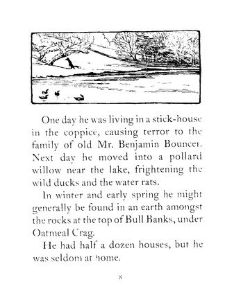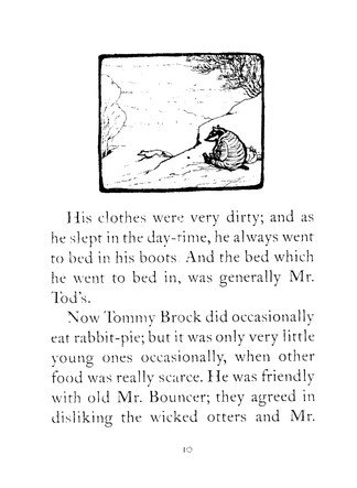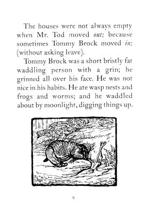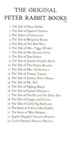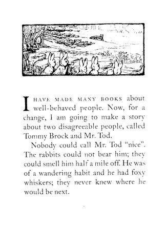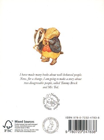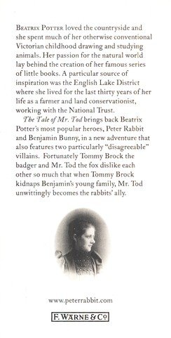 The Tale of Mr Tod brings back Beatrix Potter's most popular heroes, Peter Rabbit and Benjamin Bunny, in an adventure that also features two very disagreeable villains. Fortunately Tommy Brock the badger and Mr. Tod the fox dislike each other so much that they Tommy Brock kidnaps Benjamin's young family, Mr Tod unwittingly becomes the rabbits' ally. The Tale of Mr Tod is number 14 in Beatrix Potter's series of 23 little books, the titles of which are as follows: 1 The Tale of Peter Rabbit 2 The Tale of Squirrel Nutkin 3 The Tailor of Gloucester 4 The Tale of Benjamin Bunny 5 The Tale of Two Bad Mice 6 The Tale of Mrs. Tiggy-Winkle 7 The Tale of Mr. Jeremy Fisher 8 The Tale of Tom Kitten 9 The Tale of Jemima Puddle-Duck 10 The Tale of the Flopsy Bunnies 11 The Tale of Mrs. Tittlemouse 12 The Tale of Timmy Tiptoes 13 The Tale of Johnny Town-Mouse 14 The Tale of Mr. Tod 15 The Tale of Pigling Bland 16 The Tale of Samuel Whiskers 17 The Tale of The Pie and the Patty-Pan 18 The Tale of Ginger and Pickles 19 The Tale of Little Pig Robinson 20 The Story of a Fierce Bad Rabbit 21 The Story of Miss Moppet 22 Appley Dapply's Nursery Rhymes 23 Cecily Parsley's Nursery Rhymes