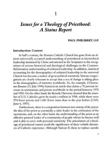 The final three articles reflect on ordained ministry from distinctive perspectives. Benedict Ashley, OP, takes the Letter to the Hebrews as his starting point. Paul Wesche looks at priesthood through the lens of an Eastern Orthodox priest. Donald Goergen, OP, asks what insights African theology, specifically African Christology, might offer a contemporary Catholic theology of priesthood. Paul Philibert, OP, provides a concluding reflection.