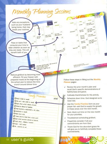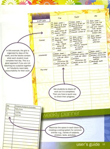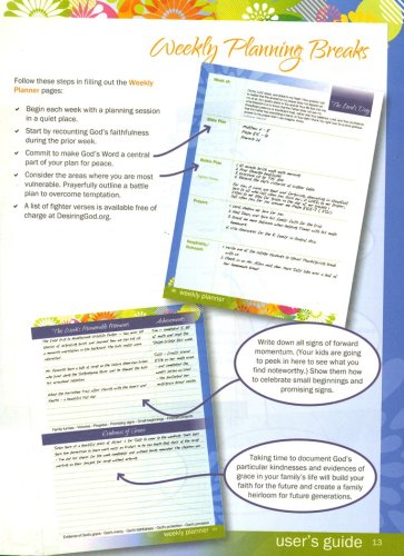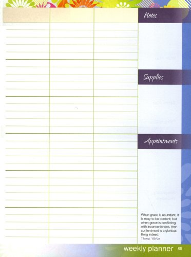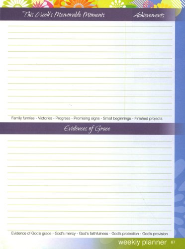 Weekly plans provide room to write in your Bible plan, battle plan, prayers, hospitality/outreach efforts, memorable moments, achievements, and evidences of grace. Schedule pages may be filled in as you see fit—both the vertical axis and horizontal axis are blank for you to fill in days and subjects as you prefer. Boxes along the facing page include room for notes, supplies, and appointments. The plastic covers include folder pockets on the inside for handy storage. Spiral bound.
