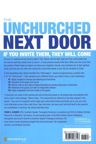 In a national survey conducted by author Thom Rainer and his staff, eight out of ten unchurched men and women said they would come to church—if only someone would invite them. When and how is the next big question. Rainer helps you figure out where your neighbors, friends, and coworkers are in their spiritual quest, and how you can know who among the unchurched people in your life are receptive to Christ. In this fascinating book, Rainer identifies five "faith stages" that represent your running buddy, your sister-in-law, or your hairdresser. "A discovery we made is that reaching lost and unchurched people is not always best accomplished with some cookie-cutter strategy," Rainer writes. "The unchurched are different in how they respond to the gospel." How different? You will be amazed at the variables that exist when it comes to how open people are to the Christian message. Open this book, and open your mind and heart to the powerful new possibilities of reaching The Unchurched Next Door.