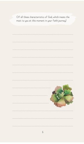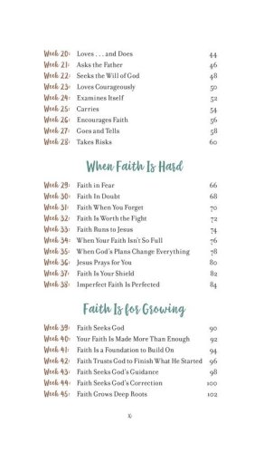 A biblical theme to focus onA short but impactful Bible verse to help you reflect and meditateInspirational insight to guide your thoughts and jumpstart your faith projectJournaling prompts and lines to help you reflect and cultivate a genuine faith