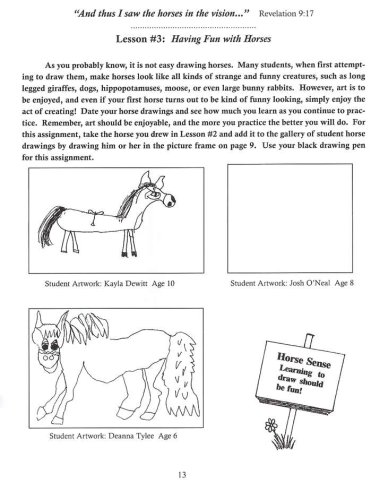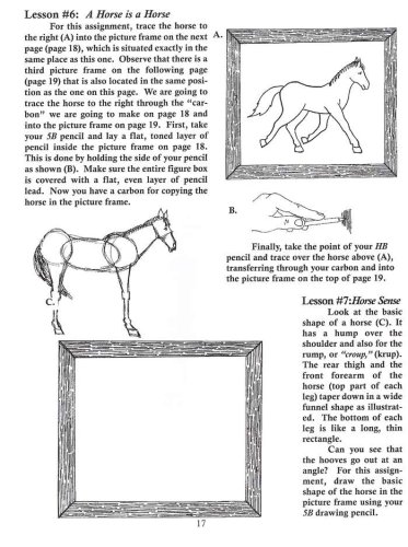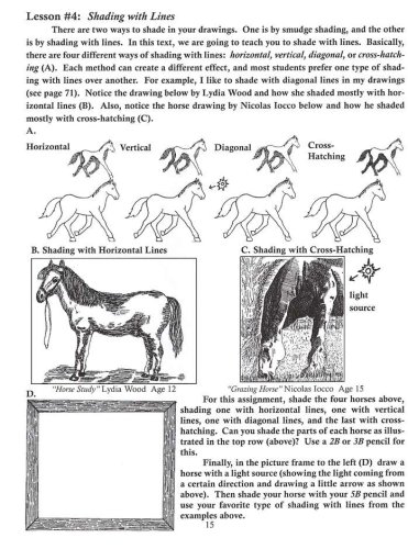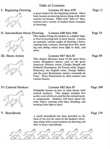 Do sketches of ponies keep showing up in the margins of your kids' homework? Here's your chance to develop that "doodling" into art! Designed for ages 8 and up, Stebbing's curriculum offers 87 progressive lessons that emphasize the value of practice and provide drawing tips, black-and-white samples of student artwork, sketches by master artist Leonardo da Vinci, and horse trivia. 119 pages, softcover.