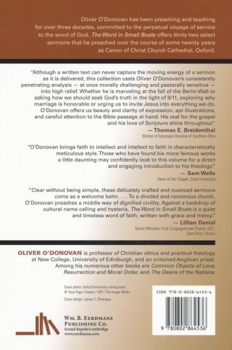 Oliver O'Donovan has been preaching and teaching for over three decades. Committed to the perpetual voyage that is the service of the Word of God, O'Donovan has a scholarly, yet immanently practical approach to theology that enriches both the mind and the Spirit, while calling one to an intelligent and compassionate interaction with the world. In The Word in Small Boats, O'Donovan offers thirty-two select sermons that he has preached over the course of some twenty years.