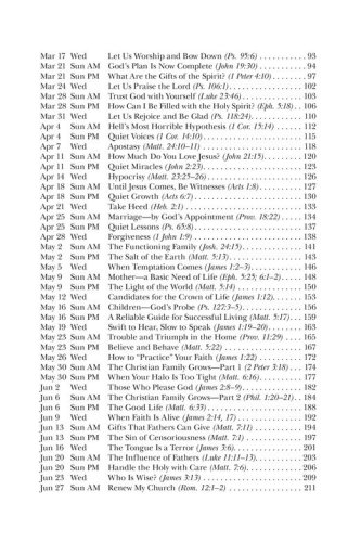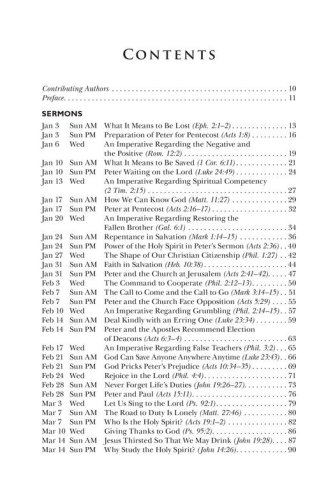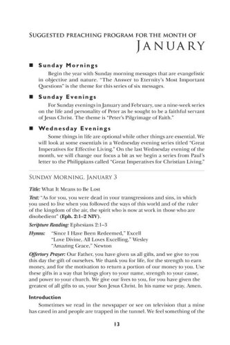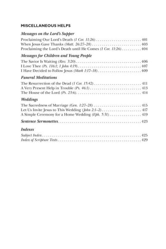 Morning and evening services for every Sunday of the yearSermon topics and texts fully indexedDefinitive and usable sermon outlinesDevotionals and Bible studies for midweek servicesFresh and applicable illustrationsAppropriate hymn selectionsSpecial-day services for church and civil calendarsMeditations on Lord's Supper observanceWedding ceremonies and themesFuneral messages and ScripturesBasic pastoral ministry helpsMessages for children and young peopleOffertory prayers