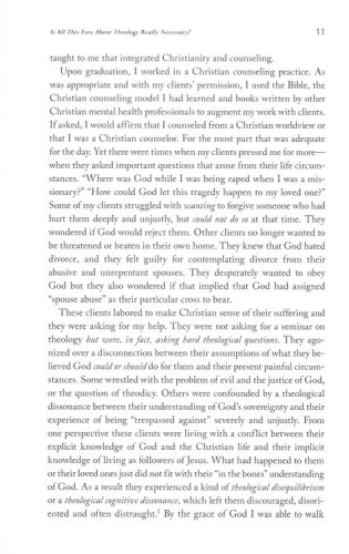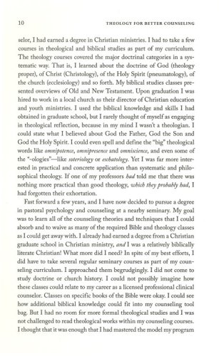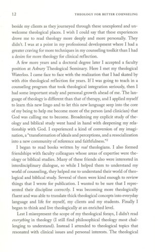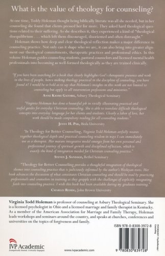At one time, Virginia Todd Holeman "Toddy" thought being biblically literate was all she needed and had little interest in what real theologians talked about. But in her counseling she found that clients pressed her for more. They didn't just want what she had gained through training in the best theories and practices available for counseling. They asked hard theological questions often related to their suffering. As she describes it, they experienced a kind of "theological disequilibrium . . . which left them discouraged, disoriented and often distraught." Holeman shows how deep and clear theological reflection can make a major difference in counseling practice. Not only can it shape who we are, it can also bring into greater alignment our theological commitments, our therapeutic practices and our professional ethics. All the while it can have the most practical effect on our counseling sessions. In this volume Holeman guides counseling students, pastoral counselors and licensed mental health professionals into becoming as well-formed theologically as they are trained clinically.