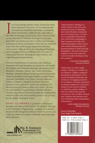 Schwarz's initial focus on European and American Protestant theology broadens to include the rich worlds of Catholic and Orthodox theology, also looking into liberation, feminist, African, East Asian, and Indian theology. Extensive primary source quotations from such varied and eminent theological figures as John Henry Newman, Karl Barth, Paul Tillich, Jacques Maritain, Gustavo Guti?rrez, Elisabeth Schussler Fiorenza, Desmond Tutu, and more enrich the experience by allowing them to speak in their own voices. All who are interested in doing theology will find Schwarz's Theology in a Global Context invaluable in charting their relation to the past, thus enabling them to set a course for the global theological future.
