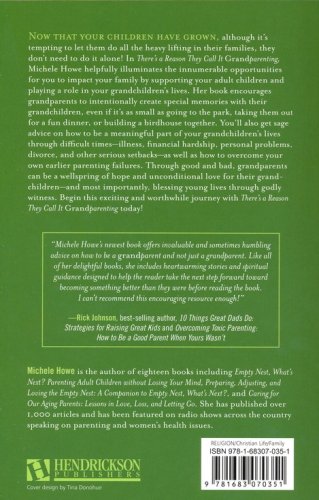 Choose to be a GRANDparent, living with eternity in mind. In There's a Reason They Call It Grandparenting, Michelle Howe illuminates opportunities for you to impact your family by supporting your adult children and playing an intentional role in your grandchildren's lives. She encourages you to create special memories with your grandkids and play a meaningful part in their lives. Each of the 30 chapters concludes with 3 GRAND IDEAS for you to consider trying.