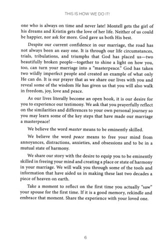 Scripture is included throughout Masterpeace to educate readers on how the word meets the world to reveal the covenant blueprint for marriage, God's reasoning for bringing man and woman together, and how children are to be raised in a godly manner. Faith is important to the Jordans and, as expressed in their book, kept their marriage strong through challenging times in career, family and walks with Christ.