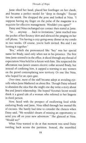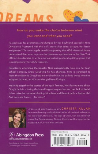 Passed over for promotion and dumped by her boyfriend, Nina O’Malley is further frustrated when her editor assigns her one of the “soft” stories she despises—covering a gala benefit supporting the AIDS Memorial Quilt. More determined than ever to prove she deserves a promotion to the NY office, Nina decides to write a series featuring a local quilting group raising money for AIDs research. At the event, she runs into her high school nemesis: Greg is a widower and the adoptive father of Jazarah, an HIV positive girl from Ethiopia. Unlike Nina, Greg has faith in a loving God, and he trusts in God’s plan for his life. Greg and Nina grow closer, and as Nina interviews the quilt families, she begins to question the choices she has made and her lack of faith. Nina suddenly finds herself facing two possible dreams, two paths for her life.