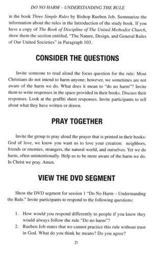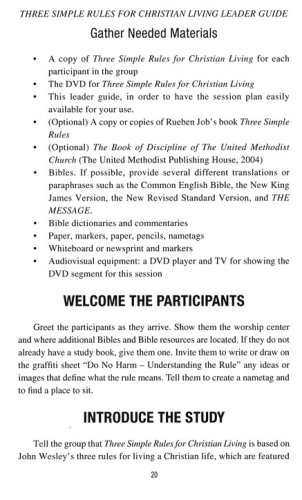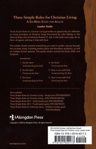 This small-group study by Jeanne Torrence Finley is based on Rueben P. Job's book Three Simple Rules: A Wesleyan Way of Living. Six sessions provide extended reflection for adults on three principles of Christian life: do no harm, do good, and stay in love with God. Each rule has a session to help you understand the rule and a session to help you explore ways to practice the rule. The Leader Guide contains everything needed to guide a group through the 6-week study, including session plans, discussion questions, and other useful information for organizing, leading, and publicizing your study group.