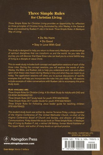 Three Simple Rules for Christian Living by Jeanne Torrence Finley and Rueben P. Job This small-group study by Jeanne Torrence Finley is based on Rueben P. Job's book Three Simple Rules: A Wesleyan Way of Living. Six sessions provide extended reflection for adults on three principles of Christian life: do no harm, do good, and stay in love with God. Each rule has a session to help you understand the rule and a session to help you explore ways to practice the rule. Your church can do a church-wide study of the three simple rules by using the youth resource, Three Simple Rules 24/7, and the children’s resource, Three Simple Rules for Following Jesus, along with this book. A leader guide and DVD for adult study groups are available. Parents who would like to discuss the three simple rules with their children can download a free list of suggested questions at Cokesbury.com (click below). Jeanne Torrence Finley is a clergy member of the Virginia Conference of the United Methodist Church, co-chair of the Virginia Conference Board of Church and Society, and director of Collegial Communications. She has worked as a campus minister, pastor, college English teacher, workshop leader, and communications consultant. Finley writes regularly for FaithLink. Her work has appeared in the Journal of Presbyterian History, Worship, The Mennonite, Christian Science Monitor, the Virginia Advocate, and Christian Social Action. For a free online copy of Three Simple Rules A Conversation Guide for Parents click here!