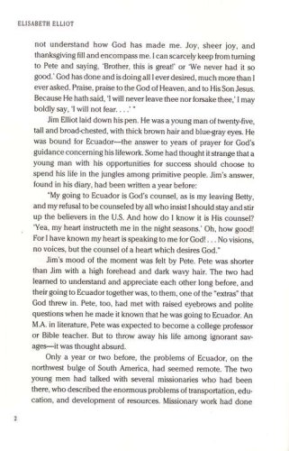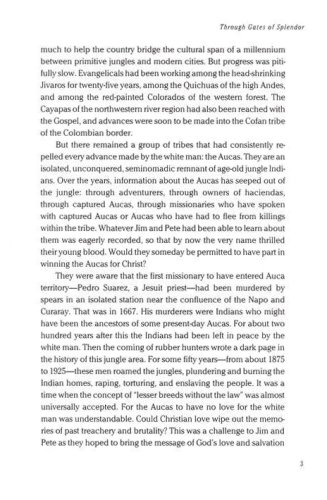 Through Gates of Splendor is the true story of five young missionaries who were savagely killed while trying to establish communication with the Auca Indians of Ecuador. The story is told through the eyes of Elisabeth Elliot, the wife of one of the young men who was killed.