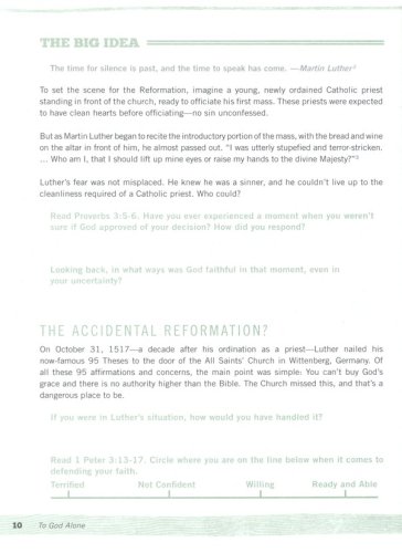 To God Alone: 5 Core Beliefs of the Reformation is a 6-session study for students that relives the work of Luther and other Reformers who challenged the teachings of the Catholic Church. More specifically, this study will examine the five core truths that came out of the Reformation, now referred to as the solas. Group members will explore these essential convictions of the faith and emerge more immersed in the gospel of Jesus Christ. The solas include: