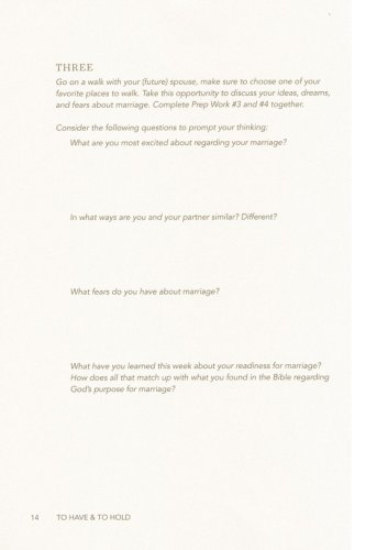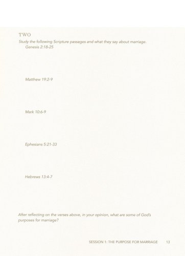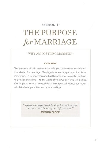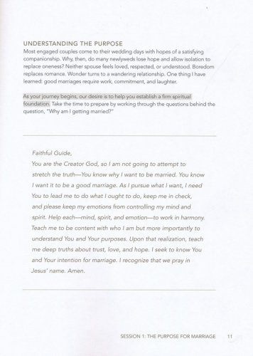 Features:Questions and tools to guide discussion and make the study personal for couplesTools and suggestions for pre-marital education and counselSeven weeks of personal study segments to complete between eight weeks of group sessions