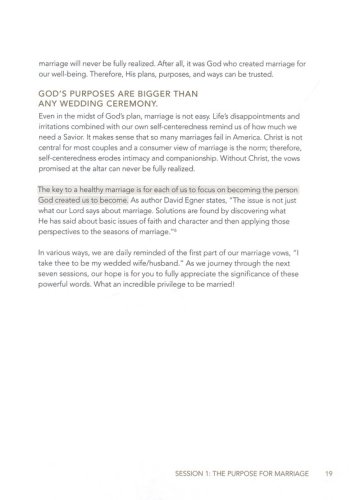 Benefits:Understand God’s biblical purpose for marriage to establish a foundation that provides stability and oneness in your relationship.Learn that following God’s principles leads to freedom in the roles and responsibilities of husband and wife.Follow God’s stewardship principles for financial freedom.Challenge thinking regarding needs, intimacy, and oneness in marriage.Keep Christ first and grow in spiritual maturity as a couple.Learn the necessary skills to effectively communicate and manage conflict.Create healthy expectations for marriage.