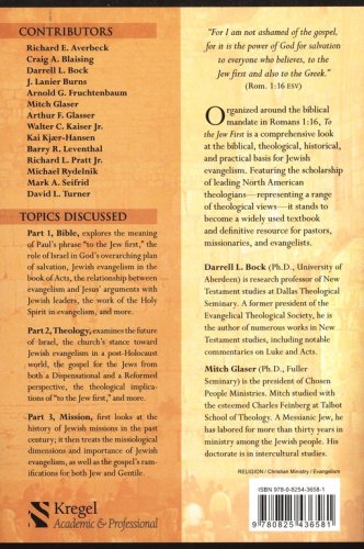 Based upon the biblical mandate to take the gospel "to the Jew first," there has been a renewed effort among Christians to bring the gospel of Jesus to the Jewish community. This comprehensive resource looks at the historical, theological, and biblical context for doing so, and provides encouragement for Christians and Messianic Jews engaged in evangelism. "To the Jew First" includes contributions by Richard A. Averbeck, Craig A. Blaising, Walter C. Kaiser, Richard L. Pratt Jr., and ten other evangelical scholars.