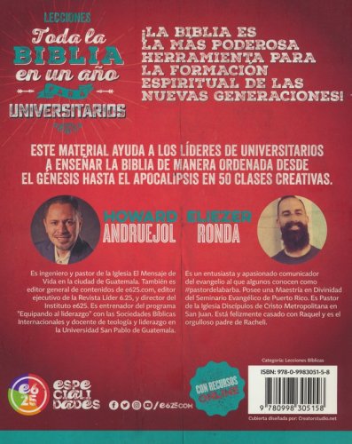 La Biblia es la herramienta mas poderosa para la formacion espiritual de las nuevas generaciones y este material ayuda a los maestros y lideres de jovenes a ensenarla de manera ordenada desde el Genesis hasta el Apocalipsis en 50 clases creativas e inolvidables. Incluye hojas de trabajo y actividades online.