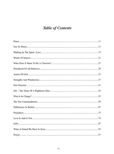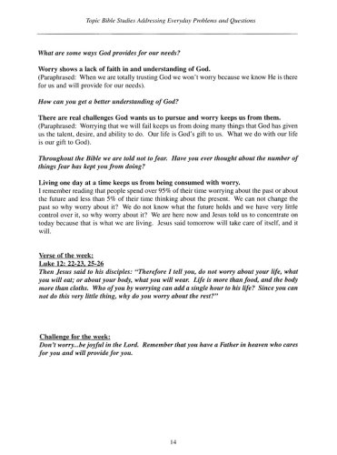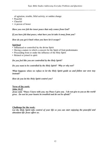 The Topic Bible Studies Addressing Everyday Problems and Questions study series is designed to be thought-provoking to help guide youth into a better understanding of God and themselves, and to deal with everyday issues that we all face. The study is equally appropriate for adults and youth; however, the example situations are primarily aimed at addressing issues that are more specific to youth. The series is interactive and is meant to generate self-examination and discussion. The study focuses on our need for a personal relationship with Jesus Christ, and seeks to reveal how the Lord is active in our lives through the Holy Spirit. The series assists students in discovering how God has made them unique, with their own special qualities and abilities to share with the world. The lessons also extend a challenge for each week to specifically incorporate what they have learned into their daily lives.