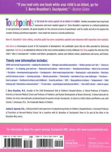 All over the U.S. and in over twenty countries around the world, Touchpoints has become required reading for anxious parents of babies and small children. T. Berry Brazelton's great empathy for the universal concerns of parenthood, and honesty about the complex feelings it engenders, as well as his uncanny insight into the predictable leaps and regressions of early childhood, have comforted and supported families since its publication in 1992. In this completely revised edition Dr. Brazelton introduces new information on physical, emotional, and behavioral development. He also addresses the new stresses on families and fears of children, with a fresh focus on the role of fathers and other caregivers. This updated volume also offers new insights on prematurity, sleep patterns, early communication, toilet training, co-sleeping, play and learning, SIDS, cognitive development and signs of developmental delay, childcare, asthma, a child's immune system, and safety. Dr. Sparrow, Brazelton's co-author on several other books, brings a child psychiatrist's insights into the many perennial childhood issues covered in this comprehensive book. No parent should be without the reassurance and wisdom Touchpoints provides.