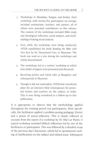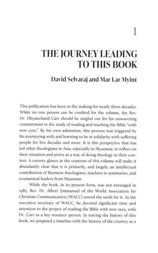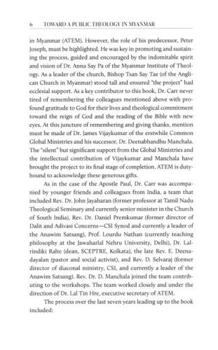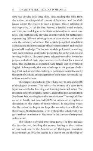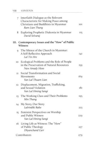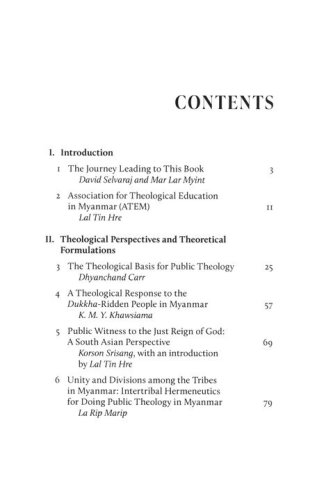 The volume is divided into three parts. The first offers an introduction, leading up to the book and to the Association of Theological Education in Myanmar (ATEM), the second a section on theology of Public Witness and broad theoretical formulations concluding with a wide array of the contemporary issues on the ground. The articles come out of the five workshops, for professional theologians from seminaries, social activists from a Christian faith background and pastors.