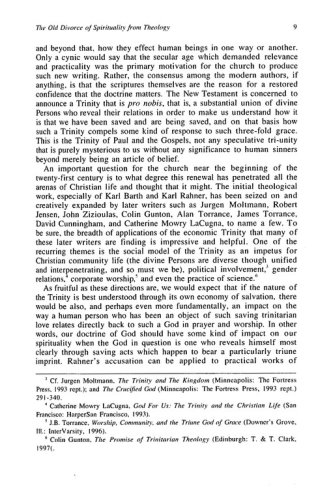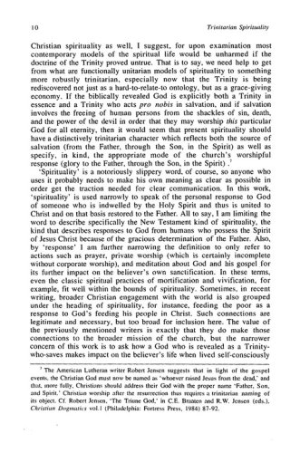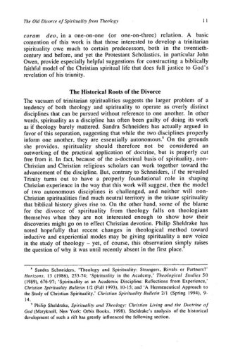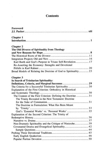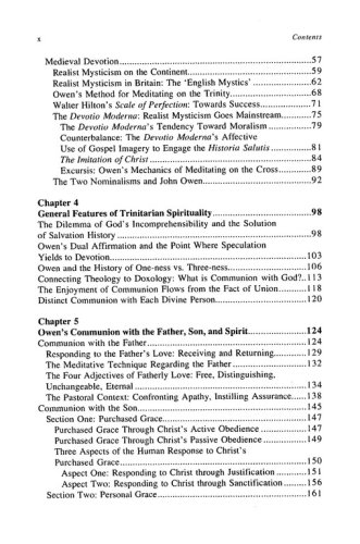 This work examines the problem of how to connect the historic doctrine of the Trinity to Christian devotional practice. Two criteria for a successful Trinitarian spirituality are proposed: that of drawing significantly from nuances of the classic formulations of the doctrine, and dealing with the mode of original Trinitarian self-disclosure, that is, the unfolding biblical doctrine of the historia salutis. Various historical attempts at articulating a method are examined, with special emphasis given to the Puritan John Owen.