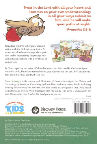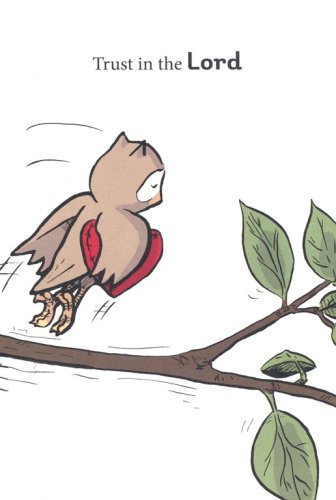 In Trust: A Bible Memory Book a plucky owl takes off alone but soon runs into trouble. He can't figure out what to do, but wisely remembers to pray and learns to: Trust in the Lord with all your heart and lean not on your own understanding; in all your ways submit to him, and he will make your paths straight. Proverbs 3:5-6 (NIV)