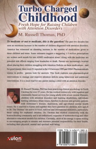 To medicate or not to medicate, this is the question The past two decades has seen an enormous increase in the number of children diagnosed with attention disorders. America has witnessed an alarming increase in the number of medications given to these children and teens. Some estimates suggest a staggering 1-3 million prescriptions are written each month for one ADHD medication alone Along with the medicines are potential side effects ranging from headaches to death. Parents are increasingly worried about placing their children struggling with Attention Deficits on these medications.and for good reason: there were 51 reported in the US between 1999 and 2004 Pharmaceuticals rejoice in profits: parents look for answers. This book explores non-pharmacological interventions to manage and improve attention deficits using behavioral and nutritional interventions. It is a must read for any parent raising a child with an attention disorder. M. Russell Thomas, PhD has been practicing clinical psychology in North Carolina for over 27 years. He has worked extensively with inpatient and community based services for young adults with severe mental illnesses, children with attention disorders and learning disabilities, individuals battling substance abuse issues, families in distress and geriatric patients with Alzheimer's disease, depression, and age-related mental health issues. He is married to Karen and together they have parented six children, now ages 8 to 26. The Thomas' are active in local, national and international ministries, particularly those caring for orphaned children. Dr. Thomas has worked extensively with the homeschooling community and is an enthusiastic supporter of homeschooling and other alternative education models for children. Currently, most of his energy is spent writing to encouraging people to assume and maintain personal responsibility for their health, including their physical, mental and spiritual well-being.
