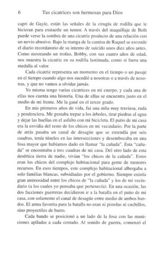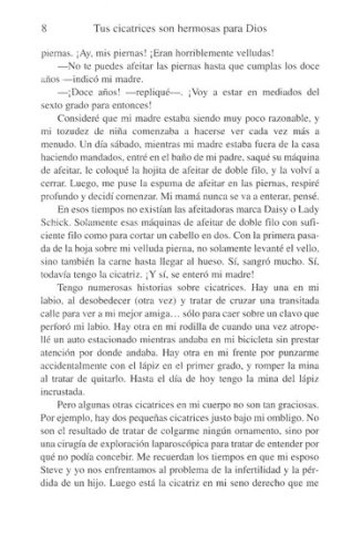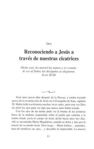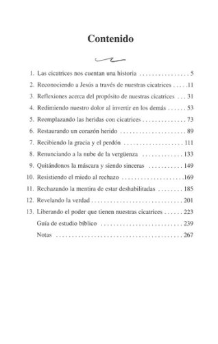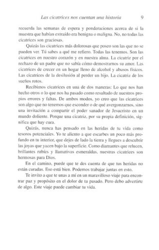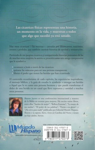Cómo encontrar paz y propósito en las heridas del pasado. Una guía de inspiración y sabiduría en Dios. Hay cicatrices internas causadas por desencantos, traiciones, errores y pérdidas, que también cuentan historias de sanidad y restauración. Partiendo de sus propias cicatrices y compartiendo historias punzantes de las de muchas otras mujeres, la autora se presenta como una amiga comprensiva que le ayudará: a reconocer a Jesús a través de las cicatrices, a quitarse las mascaras para ser una persona transparente, a liberar el poder que tienen las heridas que han cicatrizado. El contenido reconfortante de cada capítulo, las experiencias inspiradoras, el mensaje bíblico, y la guía de estudio (página 239) le ayudarán a entregar sus heridas a Aquel que la ve como una persona Hermosa y que puede transformar el dolor de una herida en un canal que lleve esperanza y sanidad a muchas otras personas.