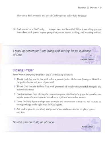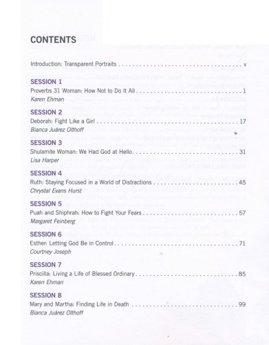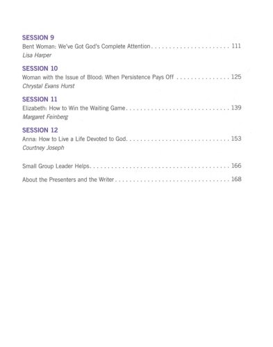 Proverbs 31 Woman: How Not to Do It All (Karen Ehman)Deborah: Fight Like a Girl (Bianca Juarez Olthoff)Shulamite Woman: We Had God at Hello (Lisa Harper)Ruth: Staying Focused in a World of Distractions (Chrystal Evans Hurst)Puah and Shiphrah: How to Fight Your Fears (Margaret Feinberg)Esther: Letting God Be in Control (Courtney Joseph)Priscilla: Living a Life of Blessed Ordinary (Karen Ehman)Mary and Martha: Finding Life in Death (Bianca Juarez Olthoff)Bent Woman: We've Got God's Complete Attention (Lisa Harper)Woman with the Issue of Blood: When Persistence Pays Off (Chrystal Evans Hurst)Elizabeth: How to Win the Waiting Game (Margaret Feinberg)Anna: How to Live a Life Devoted to God (Courtney Joseph)
