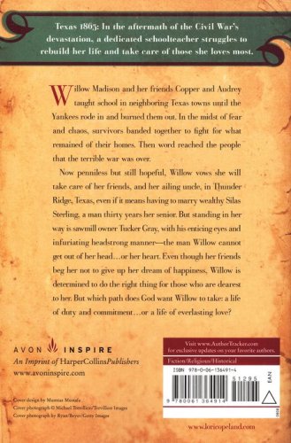 Now penniless but still hopeful, Willow vows she will take care of her friends, and her ailing uncle, in Thunder Ridge, Texas, even if it means having to marry wealthy Silas Sterling, a man thirty years her senior. But standing in her way is sawmill owner Tucker Gray, with his enticing eyes and infuriating headstrong manner—the man Willow cannot get out of her head . . . or her heart. Even though her friends beg her not to give up her dream of happiness, Willow is determined to do the right thing for those who are dearest to her. But which path does God want Willow to take: a life of duty and commitment . . . or a life of everlasting love?