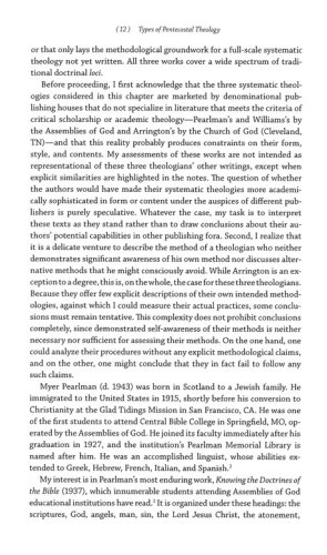 systematic/constructive theology. The four categories are based respectively on: the arrangement of biblical texts; the relationship between theology and Christian spirituality; doctrine concerning the kingdom of God; and pneumatology as a basis for philosophical and fundamental theology.