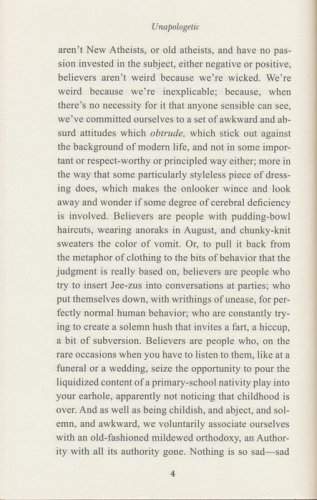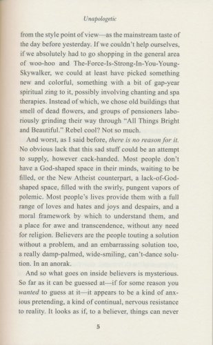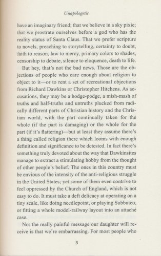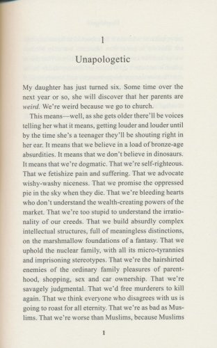 Unapologetic is a book for believers who are fed up with being patronized, for non-believers curious about how faith can possibly work in the twenty-first century, and for anyone who feels there is something indefinably wrong, literalistic, anti-imaginative and intolerant about the way the atheist case is now being made.