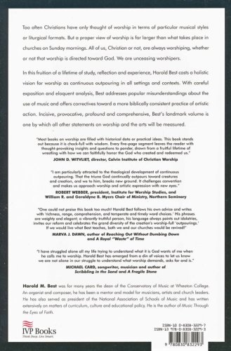 We are not created to worship. Nor are we created for worship. We are created worshiping. Too often Christians have only thought of worship in terms of particular musical styles or liturgical formats. But a proper view of worship is far larger than what takes place in churches on Sunday mornings. Worship is not limited to specific times, places or activities. God is by his very nature continuously outpouring himself. Because we are created in his image, we too are continually pouring ourselves in various directions, whether toward God or toward false gods. All of us, Christian or not, are always worshiping, whether or not that worship is directed toward God. We are unceasing worshipers. The fruition of a lifetime of study, reflection and experience, this volume sets forth Harold M. Best's understanding of worship and the arts. Widely respected as one of the foremost thinkers and practitioners in his field, Best explores the full scope of worship as continuous outpouring in all settings and contexts. With careful exposition and eloquent analysis, Best casts a holistic vision for worship that transcends narrow discussions of musical style or congregational preference. On this broader canvas, Best addresses popular misunderstandings about the use of music and offers correctives toward a more biblically consistent practice of artistic action. Incisive, biblical, profound and comprehensive, Best's landmark volume is one by which all other statements on worship and the arts will be measured.