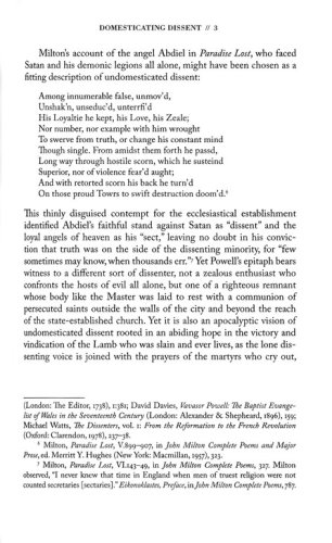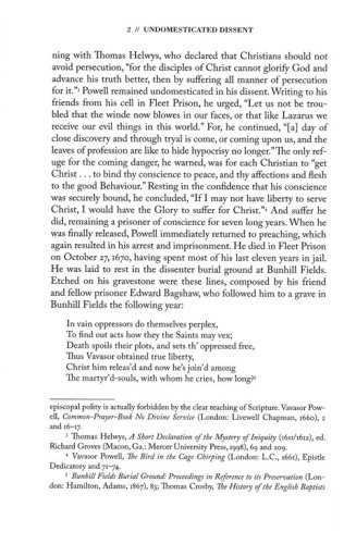 On the north end of London lies an old nonconformist burial ground named Bunhill Fields. Bunhill became the final resting place for some of the most honored names of English Protestantism. Burial outside the city walls symbolized that those interred at Bunhill lived and died outside the English body politic. Bunhill, its location declares, is the proper home for undomesticated dissenters.