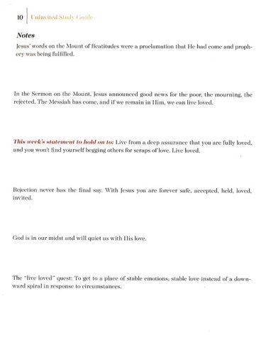 Be a part of this biblical learning process of "living loved." Uninvited will remind you and your group that you are destined for a love that can never be diminished, tarnished, shaken, or taken—a love that does not reject or uninvite.