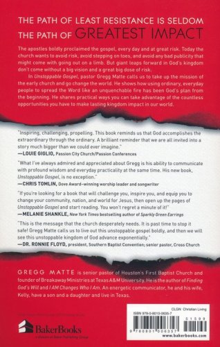 In Unstoppable Gospel, pastor Gregg Matte calls readers to take up the task of the early church and go change the world. He shows how using ordinary, everyday people has been God's plan from the beginning and how we all have a part in that plan. He shares many practical ways Christians can get involved in their churches and communities to take advantage of the countless opportunities God provides for us to make a lasting kingdom impact in our world.