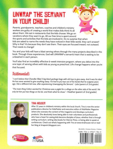 This generation of children is growing up thinking the world revolves around them and their wants. Their thinking is so focused inward, they do not know how see needs of others around them and do something about it. Create a change of thinking and behavior through fun and engaging service projects designed to Unwrap The Servant in kids! This six week long program teaches children how to be a servant to others. Designed and tested by 30-year plus children's ministry veteran Tina Houser. Activities primarily for children ages 8 and up, with some appropriate for children as young as preschool.