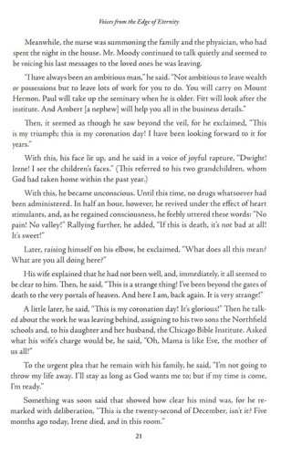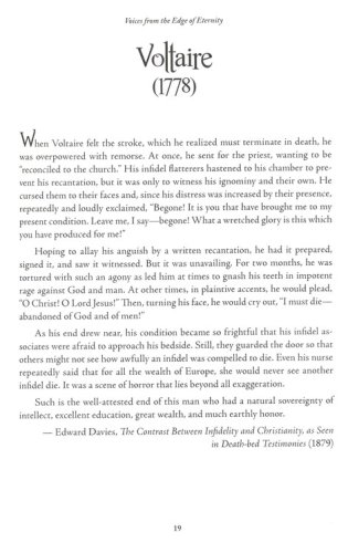 Dramatic Testimonies of Near-death Experiences and VisionsVoices from the Edge of Eternity is a compilation of the words and experiences of people both famous and obscure just before their deaths. Young and old, great and small, saint and sinnerAnd#151;these testimonies confirm the biblical doctrines of life after death, judgment for the nonbeliever, and eternal life for those who have accepted Christ as Savior. Included are the experiences of a formidable array of witnesses, such as…Martin LutherVoltaireJohn WesleyJoan of ArcThomas PaineCharles DarwinQueen Elizabeth IJohn CalvinNapoleon BonaparteKing Charles IX of FrancePeter the Great…and many more.The agreement among the accounts is remarkable in this fascinating collection of thoughts and experiences that shed light on the life that awaits us after death.