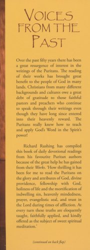 In Voices from the Past, Richard Rushing has compiled a year's worth of devotional readings into one volume. Gleaned from the works of Puritan writers, each devotion opens with a Scripture quotation, features a carefully chosen reading, and ends with the author and source. Featured Puritan authors include: John Owen, Richard Sibbes, Samuel Ward, John Bunyan, Thomas Watson, Samuel Rutherford and many more. Includes Author, Topical and Scripture indexes.