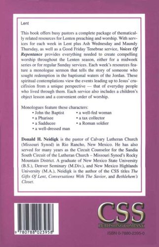 This book offers busy pastors a complete package of thematically related resources for Lenten preaching and worship. With services for each week in Lent plus Ash Wednesday and Maundy Thursday, as well as a Good Friday tenebrae service, Voices Of Repentance provides everything needed to create compelling worship throughout the Lenten season, either for a midweek series or for regular Sunday services. Each week's resources feature a monologue sermon that tells the story of someone who sought redemption in the baptismal waters of the Jordan. These spiritual contemplations view the events leading up to Jesus' crucifixion from a unique perspective — that of everyday people who lived through them. Each service also includes a children's object lesson and a convenient order of worship.Monologues feature these characters: * John the Baptist* a Pharisee * a Sadducee* a well-dressed man* a well-fed woman* a tax collector* a Roman soldierDonald H. Neidigk is the pastor of Calvary Lutheran Church (Missouri Synod) in Rio Rancho, New Mexico. He has also served for many years as the Circuit Counselor for the Sandia South Circuit of the Lutheran Church – Missouri Synod's Rocky Mountain District. A graduate of New Mexico State University (B.S.), Denver Seminary (M.Div.), and New Mexico Highlands University (M.A.), Neidigk is the author of the CSS titles The Gifts Of Lent, Conversations With The Savior, and Bethlehem's Closet.