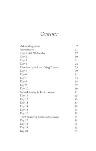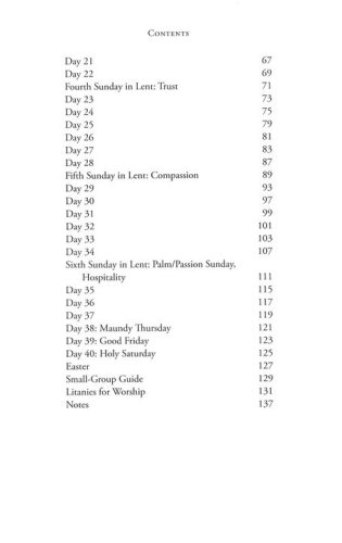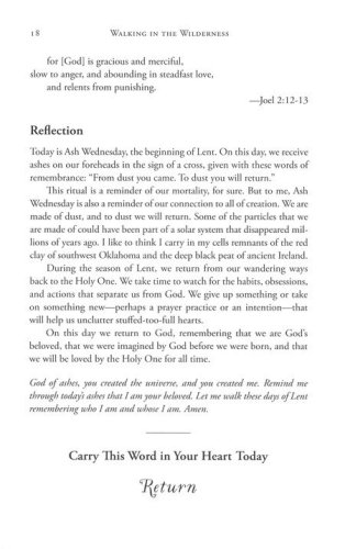 Walking in the Wilderness includes daily reflections for Ash Wednesday through Easter. A spiritual practice is introduced each Sunday of Lent: Being Present, Lament, Lectio Divina, Trust, Compassion, and Hospitality.