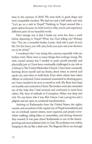 Learn life lessons to wander into grace as a way of life. In Wandering into Grace, Bishop Laurie Haller explores "wandering" as a way of life. Through the narrative of her 2018 trekking trip in Nepal, Haller shares her adventures alongside lessons for navigating difficult issues with grace, learning to adapt in a changing world, leading calmly, using collective wisdom to solve problems, serving others out of love, and the value of rest in order to be fruitful in the long haul. Through Haller’s examination of experiences wandering high on the mountain, she encourages readers to look to God as the creator, sustainer, and original wanderer who leads and guards their life story. Product Features: Author shares her story of discovery and hope on the high Himalayan trails of Nepal. Readers learn life lessons through the lens of the author’s "wanderings". Chapters explore six spiritual disciplines, waiting, negotiating, sustenance, loss, rebuilding, and rest.