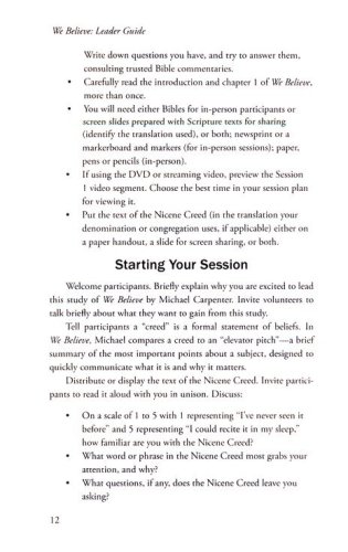 We believe in one God. The Leader Guide contains discussion questions and session plans for a six-week study of We Believe: How the Nicene Creed Can Deepen Your Faith by Michael Carpenter. It includes opening and closing prayers, optional activities, and weekly session goals. It is designed to be used with the book and DVD. Discover how the ancient Nicene Creed can transform your spiritual journey in Michael Carpenter's empowering book, We Believe: How the Nicene Creed Can Deepen Your Faith. Personal anecdotes and practical insights guide you to a profound connection with God. Dive into six chapters, covering the Nicene Creed sequentially, that unpack the essence of it, enriching reader's faith and deepening their understanding of Christian beliefs.