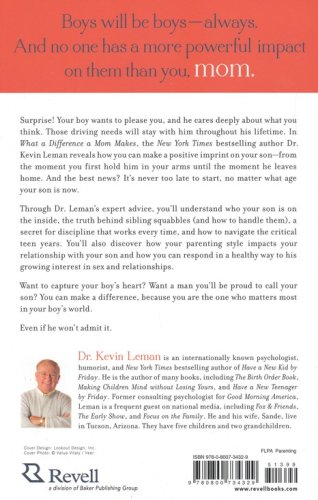 In What a Difference a Mom Makes, New York Times bestselling author Dr. Kevin Leman uses his wit and wisdom to show Mom how to lay the groundwork that will allow her son to grow into a good man. Armed with Dr. Leman's expert advice and insight, Mom will gain an understanding of her boy at every stage, from that very first diaper change to the moment he leaves for college. Dr. Leman shows how to discipline a boy, how to command respect, how to let him fight his own battles, how to understand his sexuality, and how to weather the changes in the mother-son relationship as he grows up. Most of all, Leman shows Mom how to lighten up and have some fun along the way with that boy who will always have her heart.