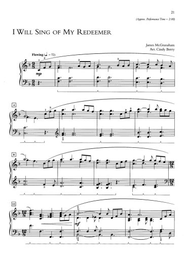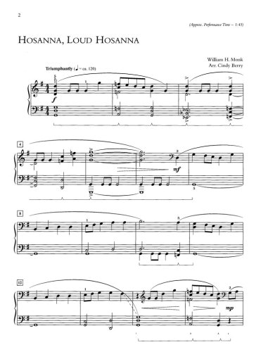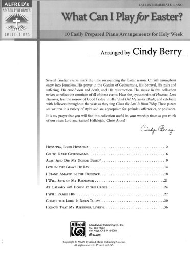This inspired collection of arrangements by Cindy Berry includes selections for Lent, Palm Sunday, Good Friday, and Easter. It is perfect for the busy church pianist who has limited rehearsal time. Each arrangement includes an approximate performance time to assist in planning. Titles: At Calvary with Down at the Cross * Alas And Did My Savior Bleed? * Christ the Lord Is Risen Today * Go to Dark Gethsemane * Hosanna, Loud Hosanna * I Know That My Redeemer Liveth * I Stand Amazed in the Presence * I Will Praise Him * I Will Sing of My Redeemer * Low in the Grave He Lay.