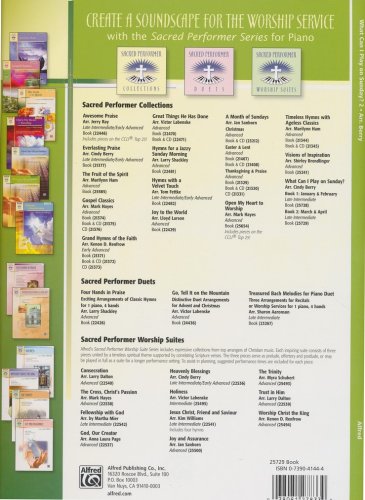 Arranged for late intermediate piano by Cindy Berry, each What Can I Play on Sunday? collection contains 10 pieces for a two-month period of the year. Book 2 covers Lent, Palm Sunday, Holy Thursday/Communion, Good Friday and Easter, as well as several general hymns. An Easter Collection is also available separately.